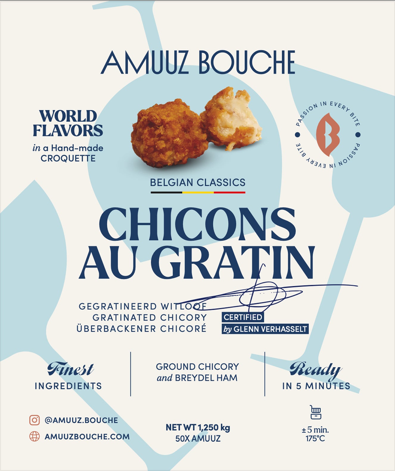 [Vleesjus, breydelham (18%) [varkensvlees, zout, suikers, rookaroma, aroma’s, kruiden en specerijen, antioxidanten (E301, E331), conserveermiddelen (E250, E262, E326), stabilisatoren (E450, E451)], witloof (18%), TARWEBLOEM, paneermeel [TARWEBLOEM, water, gist, zout, kleurstoff en (E100, E160b, E160c)], margarine [plantaardige oliën en vetten (palm en koolzaad in wisselende verhoudingen), water, emulgator (lecithinen, E471), zout, zoete weipoeder (MELK), voedingszuur (E330), aroma, kleurstof (E160a), vitaminen (vitamine A, vitamine D)], emmentaler (MELK), gruyère (MELK), battermix [SOJABLOEM, zetmeel (TARWE), gemodifi ceerd zetmeel (TARWE), TARWEBLOEM, KIPPENEI-EIWIT, verdikkingsmiddelen (E466, E415, E412), mineraalzout (E508), geleermiddel (E407a), zout], aardappelzetmeel, gelatine, palmvet, maltodextrine, cichorei, zout, asperge, aardappel, LACTOSE, suiker, MELKEIWITTEN, gistextract, ui, aroma’s, kruiden en specerijen. Kan sporen bevatten van vis, schaal- en weekdieren, noten, selderij en mosterd.]