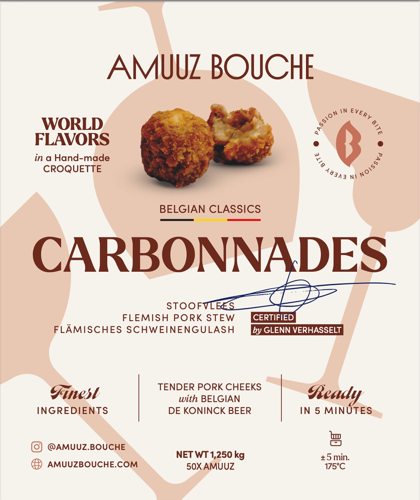 [Triple d’Anvers (25%), varkenswangetjes (24%), vleesbouillon [water, maltodextrine, zetmeel, zout, varkensvlees (5,7%), gistextract, aroma’s (TARWE), gehydroliseerde TARWE-eiwitten, gekarameliseerde suiker, knoflook, zonnebloemolie, WEI-eiwitten, tijm, paprika-extract, antioxidant (E392)], TARWEBLOEM, ui, margarine [plantaardige oliën en vetten (palm en koolzaad in wisselende verhoudingen), water, emulgator (lecithinen, E471), zout, zoete weipoeder (MELK), voedingszuur (E330), aroma, kleurstof (E160a), vitaminen (vitamine A, vitamine D)], paneermeel [TARWEBLOEM, water, gist, zout, kleurstoffen (E100, E160b, E160c)], battermix [SOJABLOEM, zetmeel (TARWE), gemodifi ceerd zetmeel (TARWE), TARWEBLOEM, KIPPENEI-EIWIT, verdikkingsmiddelen (E466, E415, E412), mineraalzout (E508), geleermiddel (E407a), zout], gelatine, zout, kruiden en specerijen. Kan sporen bevatten van vis, schaal- en weekdieren, noten, selderij en mosterd.]